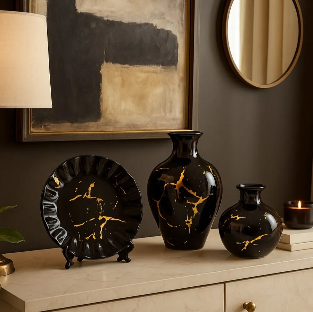 طقم ديكور سيراميك مينو - اسود وذهبي