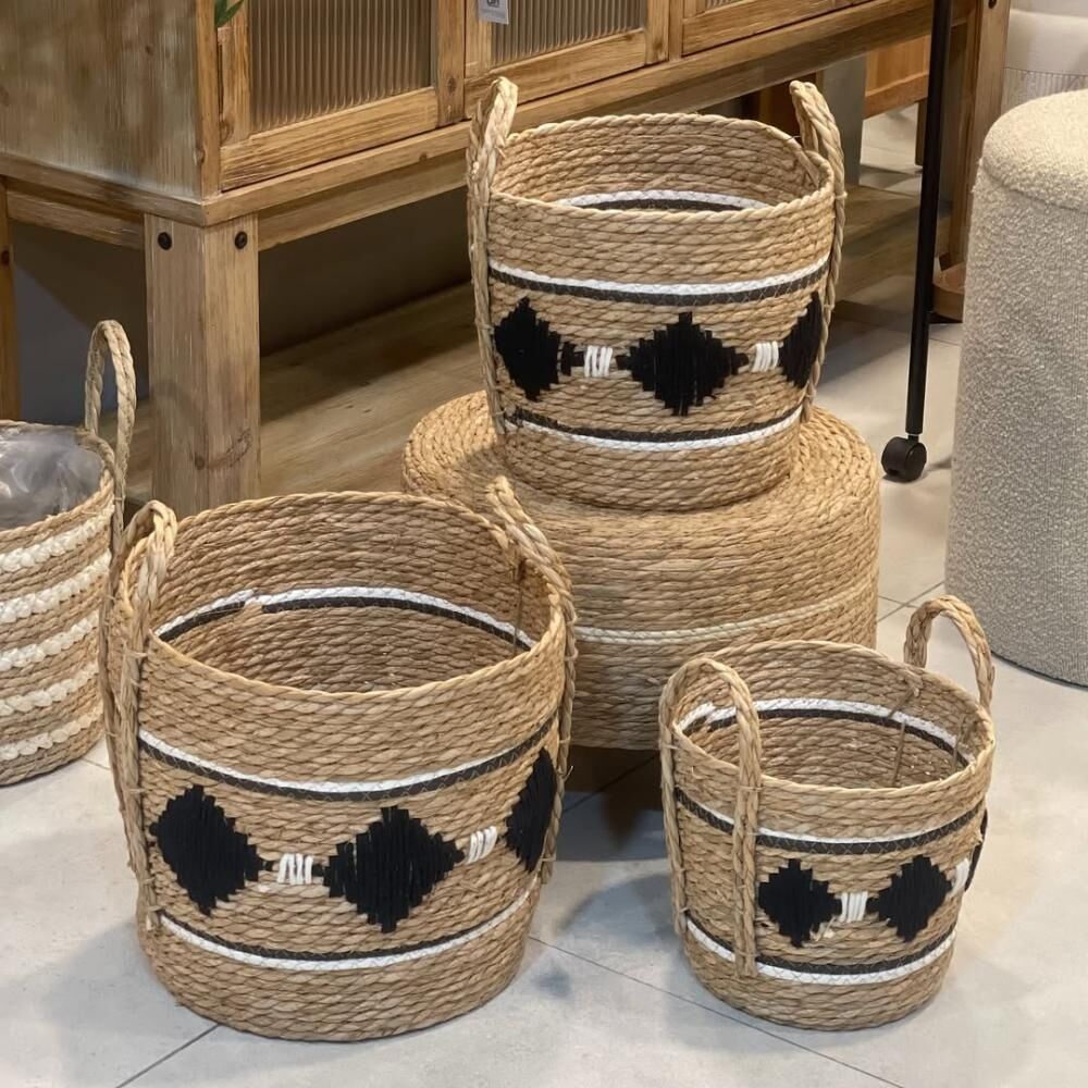 تتوفر بثلاثة أحجام مختلفة تناسب كل الاحتياجات، ومزينة بنقوش تضيف لمسة عصرية على الخامة الطبيعية. مصنوعة يدويًا بعناية خامة طبيعية 100% مثالية للديكور الريفي والبوهيمي .