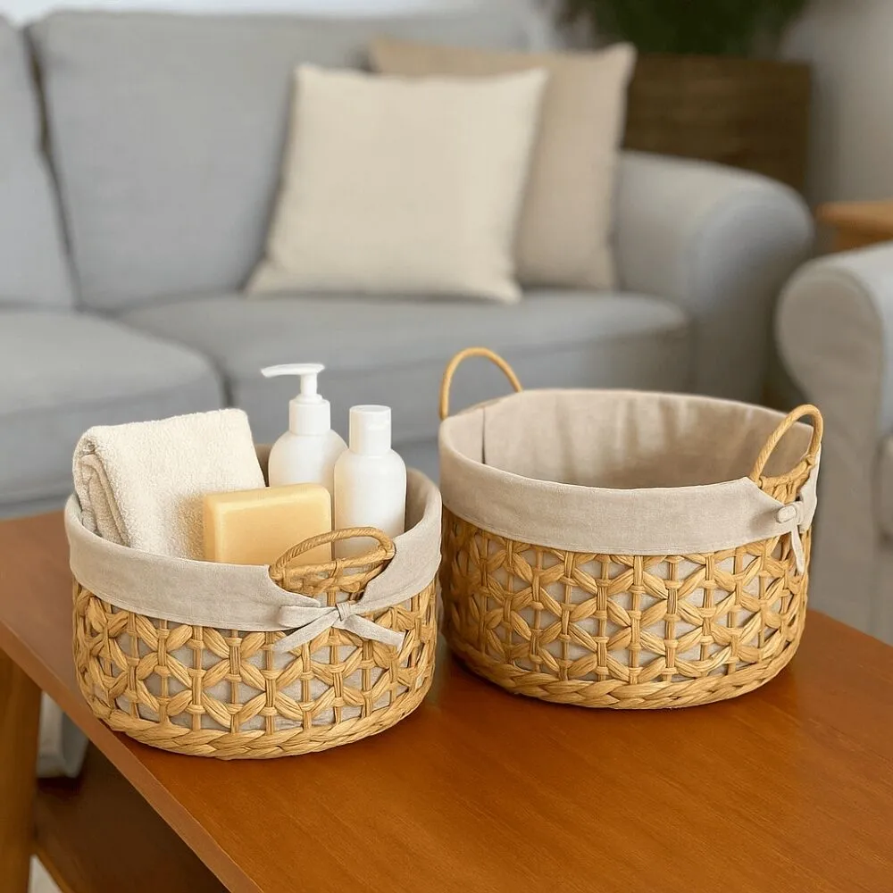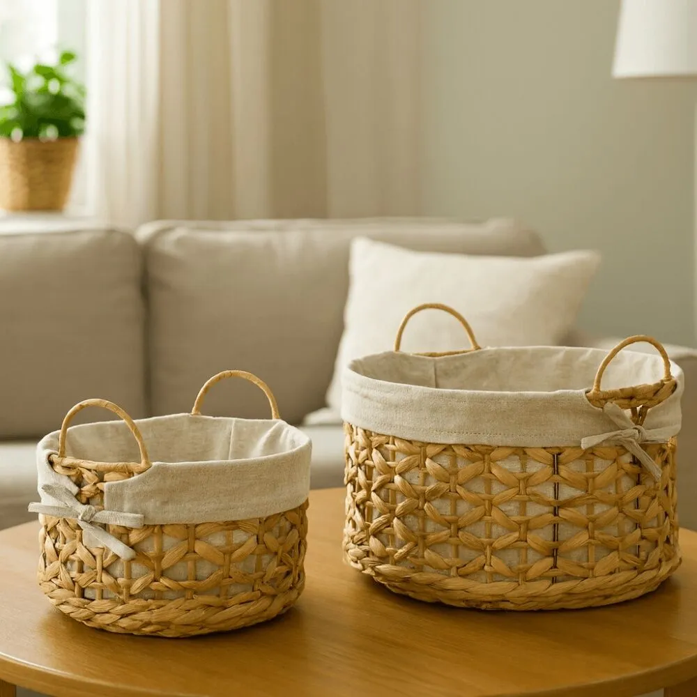 تتميّز السلال ببطانة داخلية ناعمة تساعد على حماية المحتويات، مع مقابض جانبية تسهّل الحمل والتنقّل. تصميمها المتناسق يجعلها مناسبة للعرض على الطاولات، الأرفف أو داخل الخزائن، كما تضيف لمسة دافئة وطبيعية لأي مساحة في المنزل. خيار عملي يجمع بين التنظيم والديكور في آنٍ واحد.