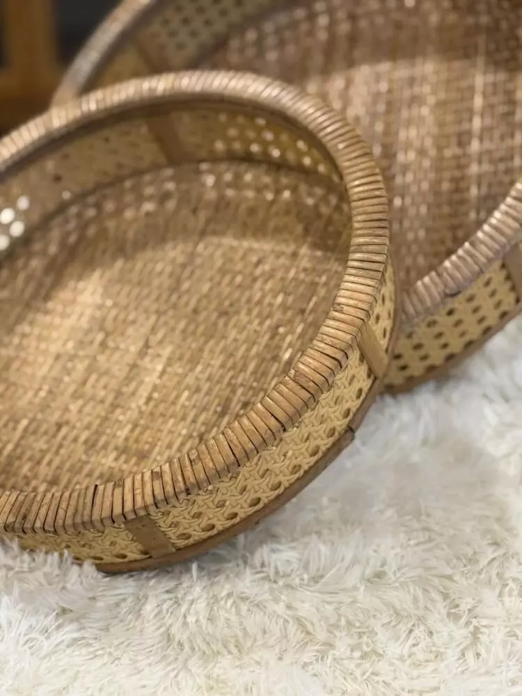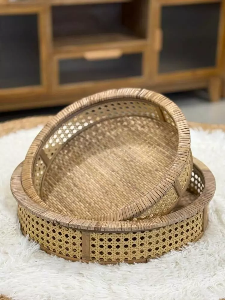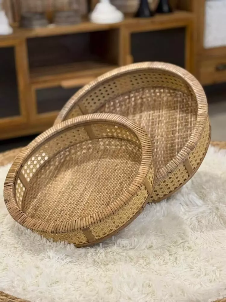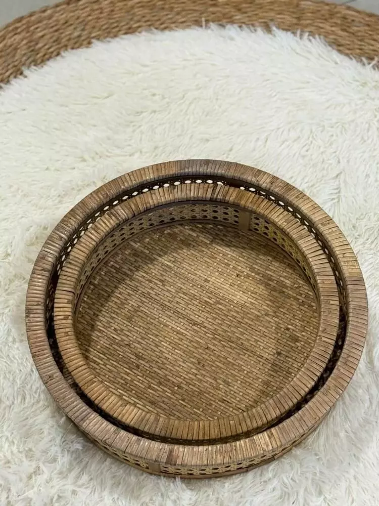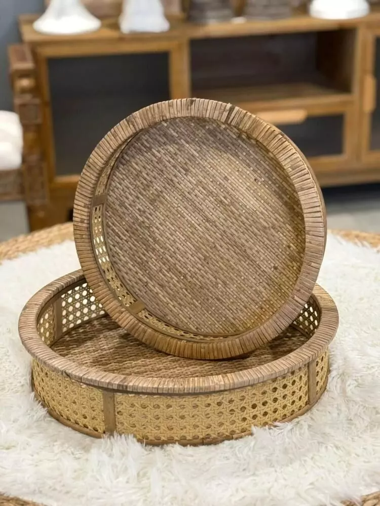 طقم صواني تقديم راتان كايل – قطعتين هو مجموعة أنيقة مصنوعة يدويًا من الخشب والراتان الطبيعي بتصميم دائري يعكس الطابع البوهيمي الدافئ والذوق الهادئ. يجمع هذا الطقم بين الجمال الطبيعي والعملية، مما يجعله مثاليًا لتقديم القهوة العربية والحلويات أو استخدامه كقطعة ديكور مميزة على طاولة المعيشة أو الكونسول. يتميز بخفة الوزن وسهولة الحمل مع حواف مرتفعة تساعد على الثبات، كما يضيف لمسة طبيعية راقية تناسب مختلف أنماط الديكور مثل الريفي والبوهيمي والمودرن. يمكن استخدامه أيضًا لتنسيق الشموع أو العطور أو في تجهيزات الضيافة والمناسبات، ليكون قطعة تجمع بين الوظيفة والجمال في كل تفصيلة.