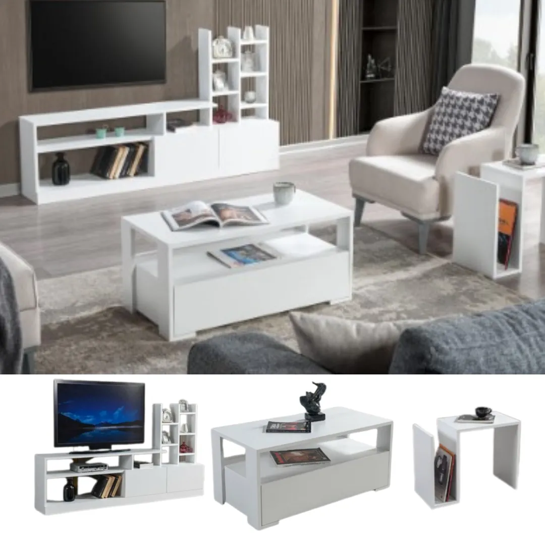 | يتضمن الطقم | عدد 1 طاولة تلفزيون دولوناي إلم كوڤ مع رفوف وادراج -ابيض ,عدد 1 طاولة قهوة بالينا إلم كوڤ - ابيض ,عدد 1 طاولة جانبية يوسون إلم كوف - أبيض |
