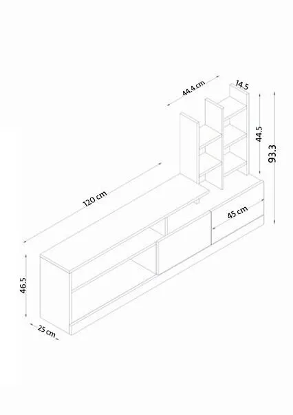 ابعاد طاولة التلفزيون : العرض : 120سم * الارتفاع : 46.8 سم *العمق :25 سم الرفوق : الارتفاع 44.5 سم *العرض :44.4 سم *العمق 14.5سم * الارتفاع الكلي :91.3 سم , ابعاد طاولة قهوة: ارتفاع 40 سم * العرض 90 سم *العمق 45 سم , ابعاد طاولة جانبية : ارتفاع 40 سم *العرض 49.9 سم العمق 29.5 سم |