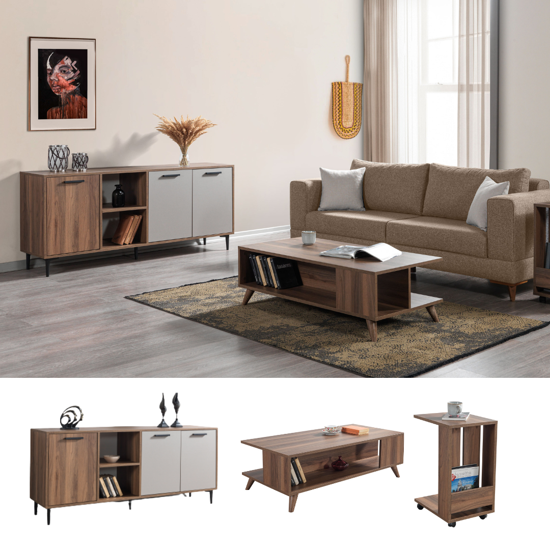 | يتضمن الطقم | عدد 1 طاولة بوفيه لينتون إلم كوڤ - بني و رمادى ,عدد 1 طاولة قهوة لوفيل إلم كوف -بني ,عدد 1 طاولة جانبية ساه إلم كوڤ مع عجلات - بني |