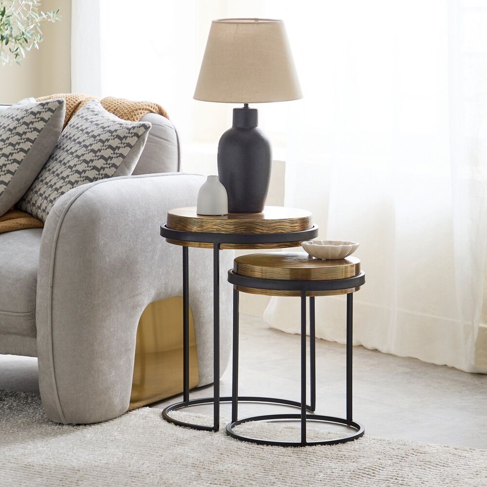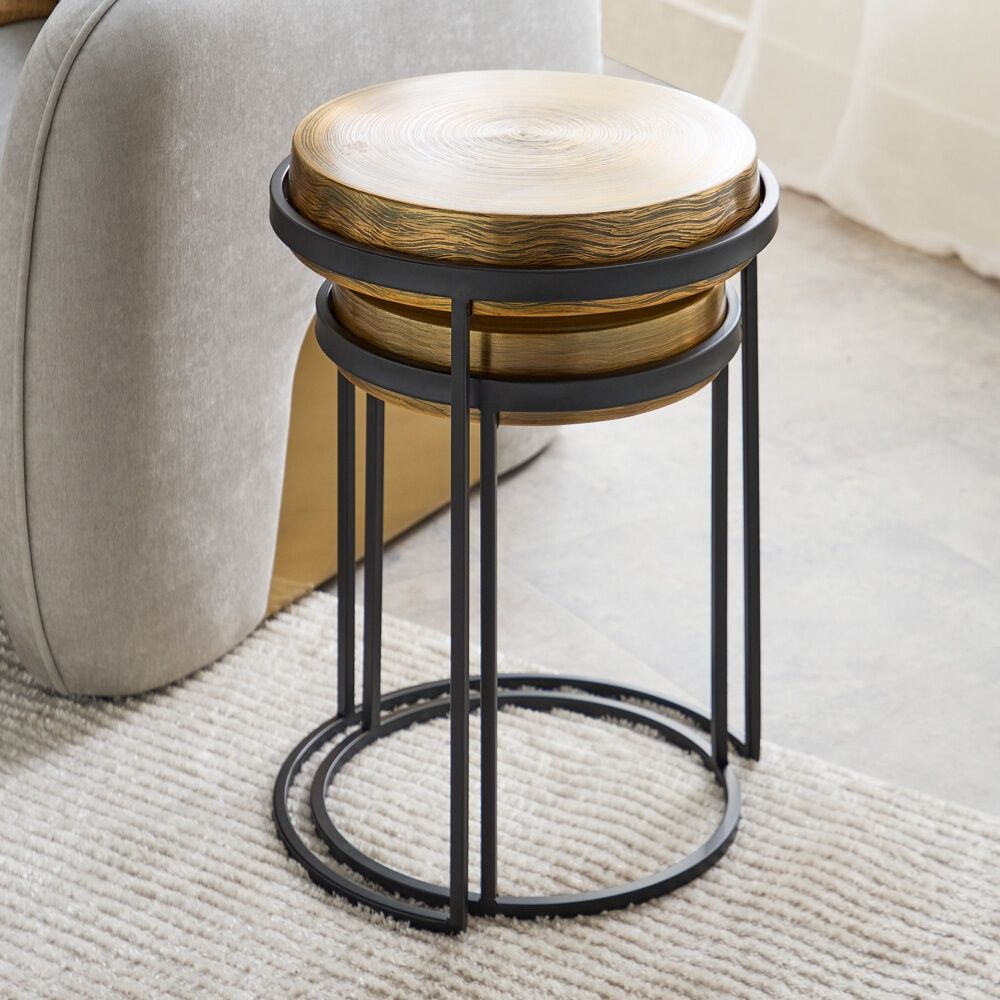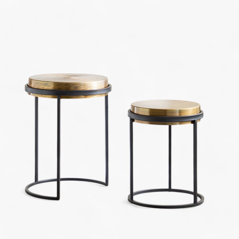 ابعاد الطاولة الكبيرة القُطر: 43 سم x الوزن: 73 كجم x الارتفاع: 56 سم ابعاد الطاولة الصغيرة القُطر: 36 سم x الارتفاع: 46 سم |