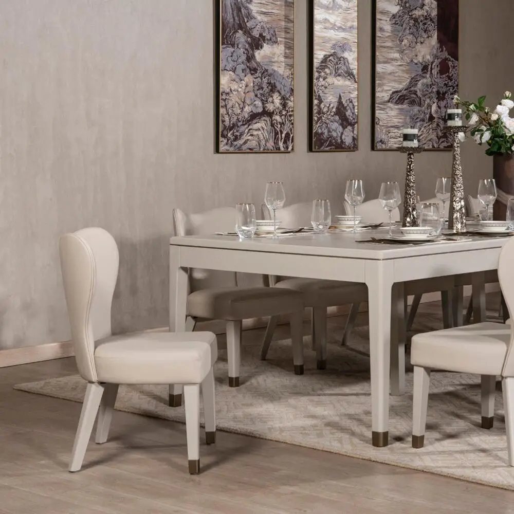 لأن وقت تناول الوجبات هو الوقت الأهم لتجمع الأسرة ولقضاء الأوقات الجميلة خلال تناول الطعام الشهي نقدم لك طقم طاولة الطعام والكراسي الفاخر. الطقم له تصميم أوروبي عصري يضمن فخامة غرفة الطعام بالإضافة للراحة التامة عند تناوله فالطاولة ذات حجم مناسب لتضمن راحة كل فرد فهي توفر مساحة كافية ومريحة لجميع الكراسي والكراسي مصممة بحيث تضمن راحتك عند الجلوس لفترات طويلة مما يجعلها مناسبة أيضاً لجلسات تدريس أطفالك وحل الواجبات المدرسية وليس فقط لتناول الطعام. الطقم مصنوع من أجود أنواع الخشب وأكثرها متانة وسهل التنظيف.