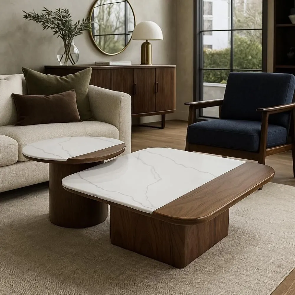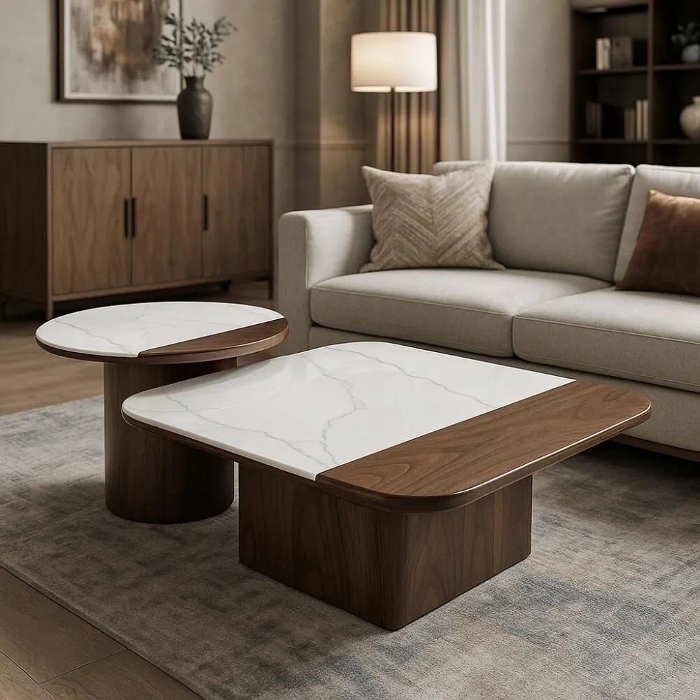 طقم طاولة قهوة أنيق يجمع بين سطح رخامي أبيض وقاعدة خشبية بتصميم عصري راقي تعزز من ثبات الطاولات وتضمن الجودة والمتانة طول فترة الاستخدام.