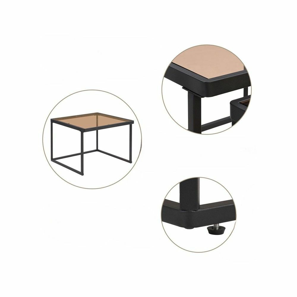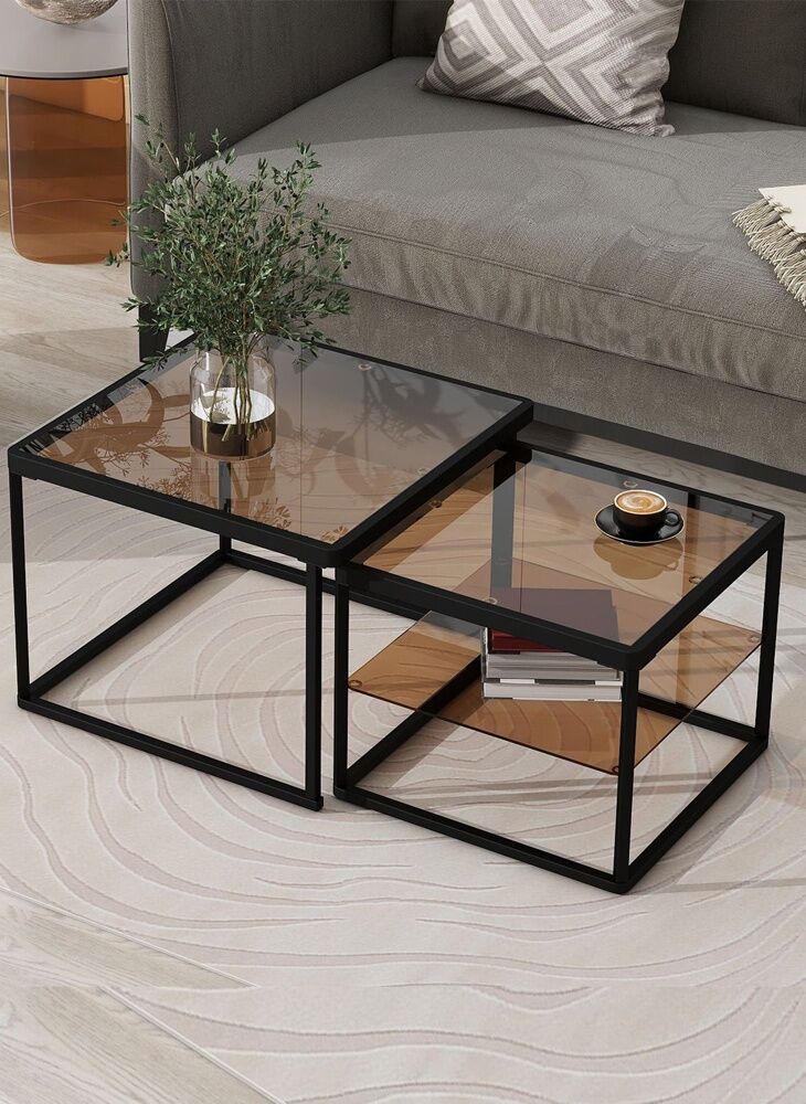طقم طاولة قهوة من قطعتين مصنوعة من زجاج مقسّى ومعادن عالية الجودة، مما يوفر متعة بصرية ومتانة فائقة. سطح الطاولة أملس ومقاوم للخدش وسهل التنظيف.