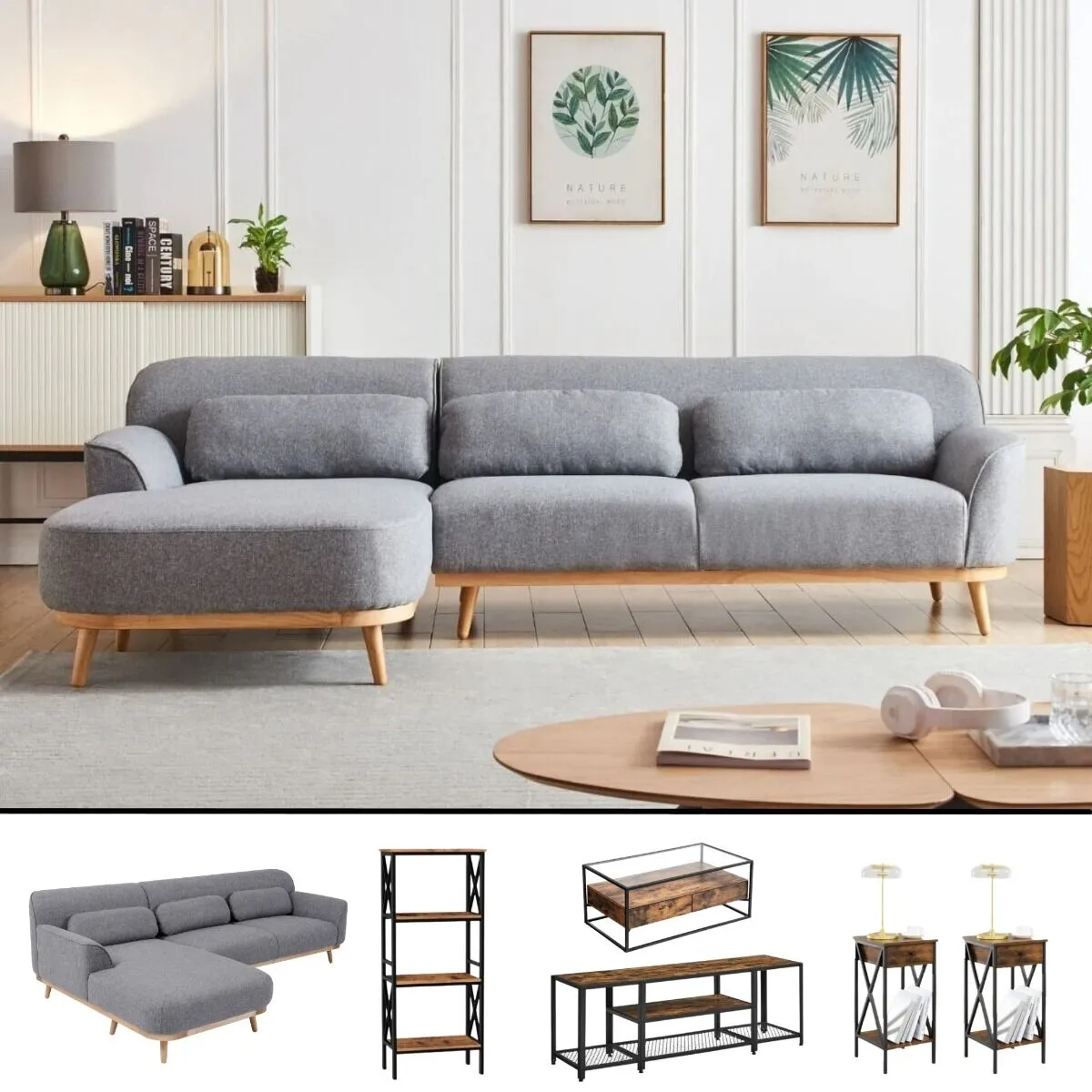 يتضمن الطقم طاولة قهوة مع ادراج تخزين, طاولتين جانبيتين, ستاند رفوف اربع ادوار, كنب ثنائي مع اريكة استرخاءو طاولة تلفزيون