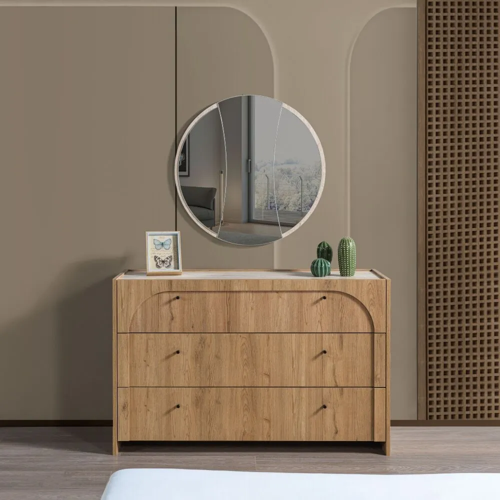 مقاسات السرير: الطول 206.4 - العرض 185 - الارتفاع 108.6 مقاس الكمدينو: العرض 58.6 - الارتفاع 40 - العمق 45 أبعاد وحدة الأدراج: العرض 123.6 - الارتفاع 79 - العمق 45 مقاسات المرآة: القطر 75 |