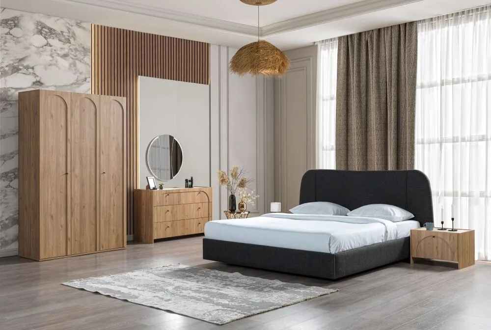 | يتضمن الطقم | 1 سرير 1 وحدة ادراج 1 مرآة 2 كومودينو فقط |