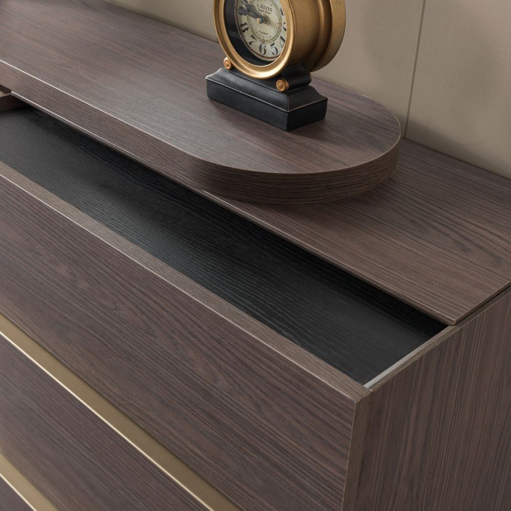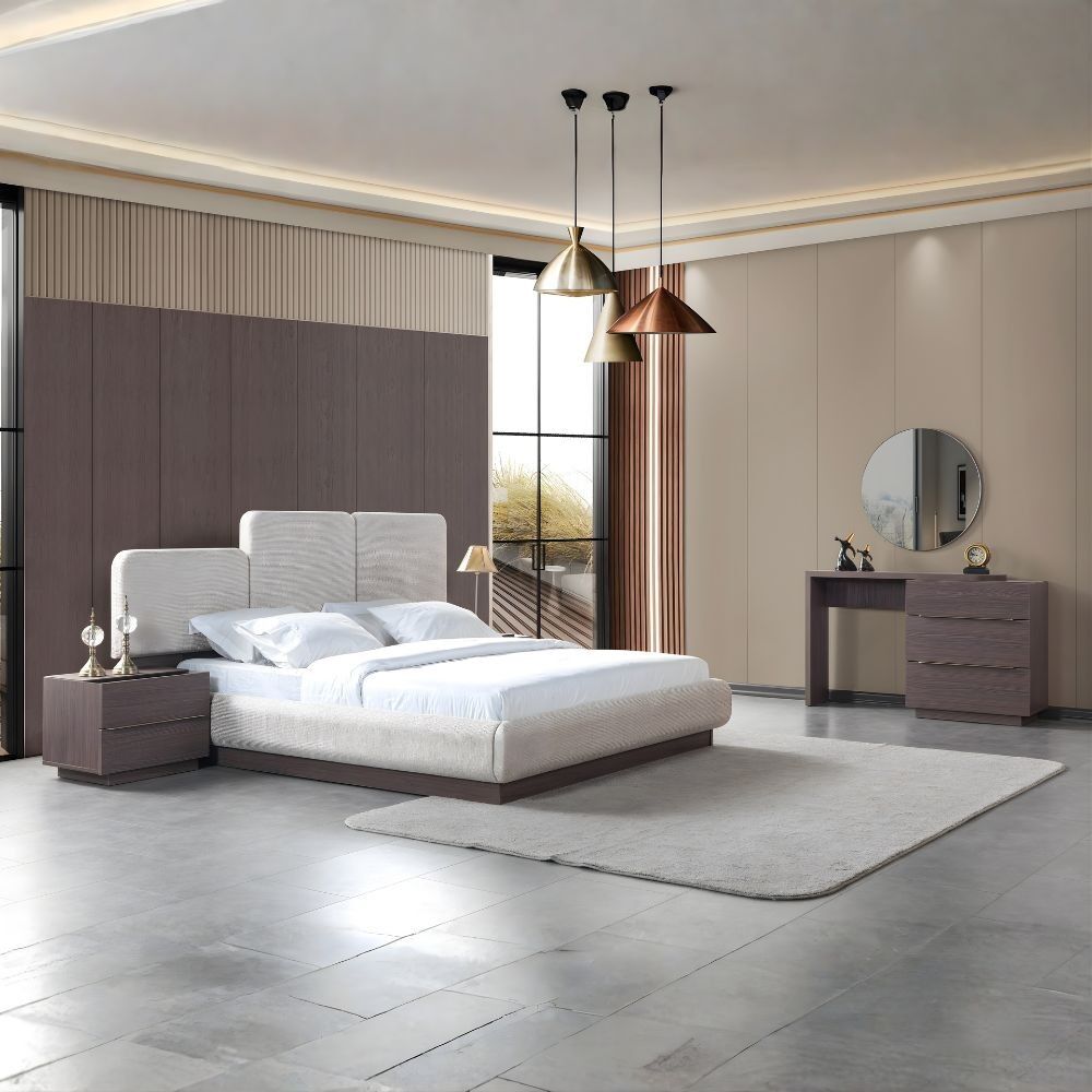 امنح غرفة نومك لمسة فاخرة تجمع بين الأناقة العصرية والراحة المطلقة مع هذا الطقم المصنوع بعناية من خشب MDF عالي الجودة، والمصمم بتناسق لوني دافئ يجمع بين البني والبيج مع تفاصيل أنيقة باللون الذهبي تضيف إشراقة فاخرة للمساحة.