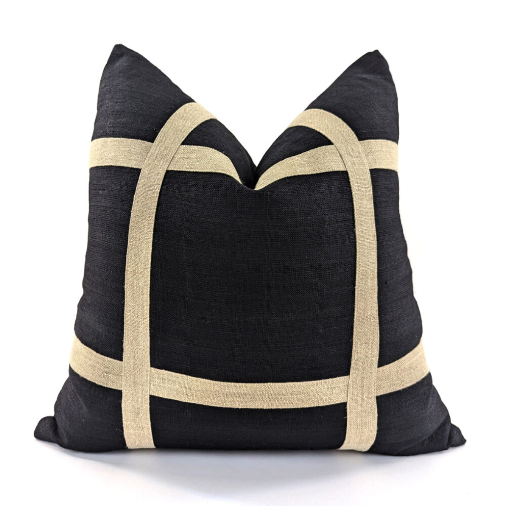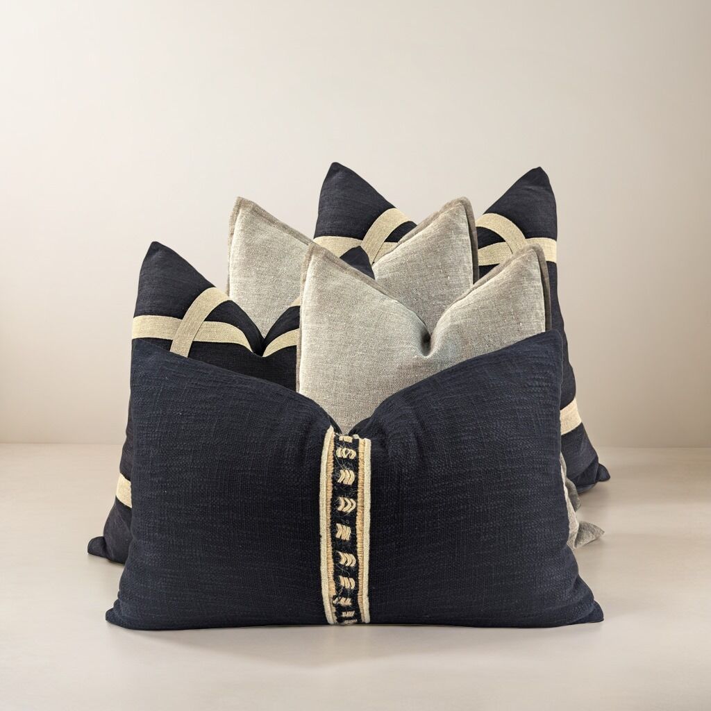 خامة الوسادة المربعة الكبيرة الجهة الامامية كتان 100% والجهة الخلفية قطن 100% تأتي باللون الاسود والبيج والوسادة الصغيرة الجهة الامامية 100% كتان والجهة الخلفية 100 % قطن تأتي باللون البيج الغامق والوسادة المستطيل الجهة الامامية والخلفية قطن 100% تأتي باللون الاسود والبيج.
