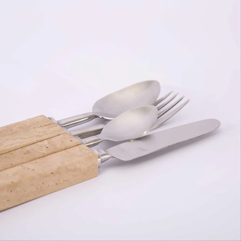 يتضمن الطقم 1 شوكة - 1 سكينة - 1 معلقة صغيرة - 1معلقة كبيرة