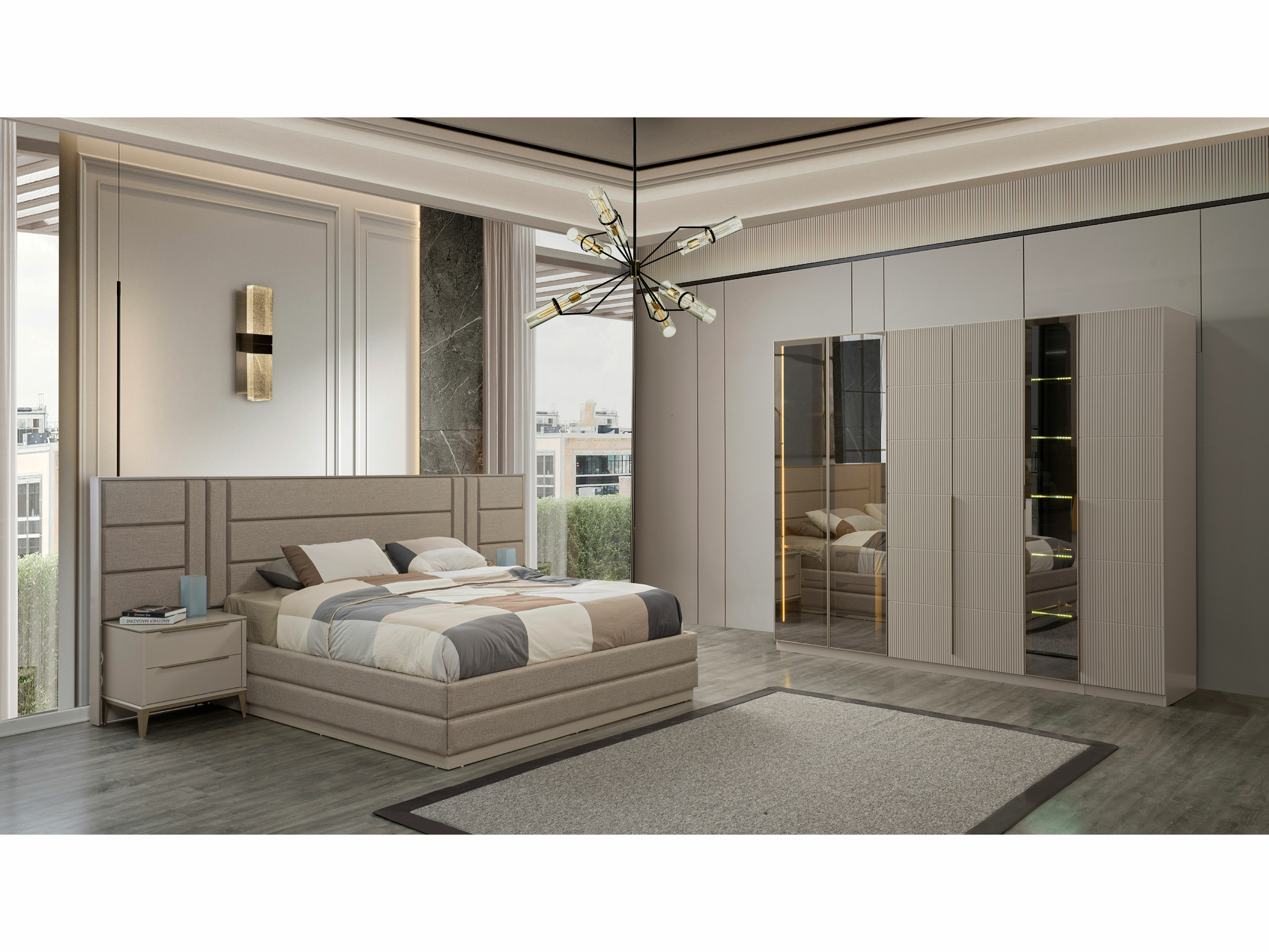 | يتضمن الطقم | سرير مزودج - 2 كمدينة بجانب السرير - تسريحة مع مرايا - أدراج أرفف |