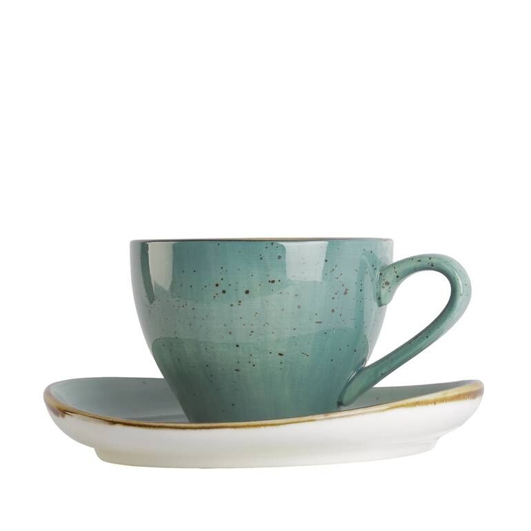 فنجان مصنوع من البورسلان باللون الأخضر مصمم لتقديم المشروبات مثل القهوة والشاي بأناقة ورفاهية, يتميز بتصميم أنيق وعصري، ويحتوي على مقبض مريح لسهولة الأستخدام وصحن يوفر قاعدة مستقرة لوضع الفنجان عليه.