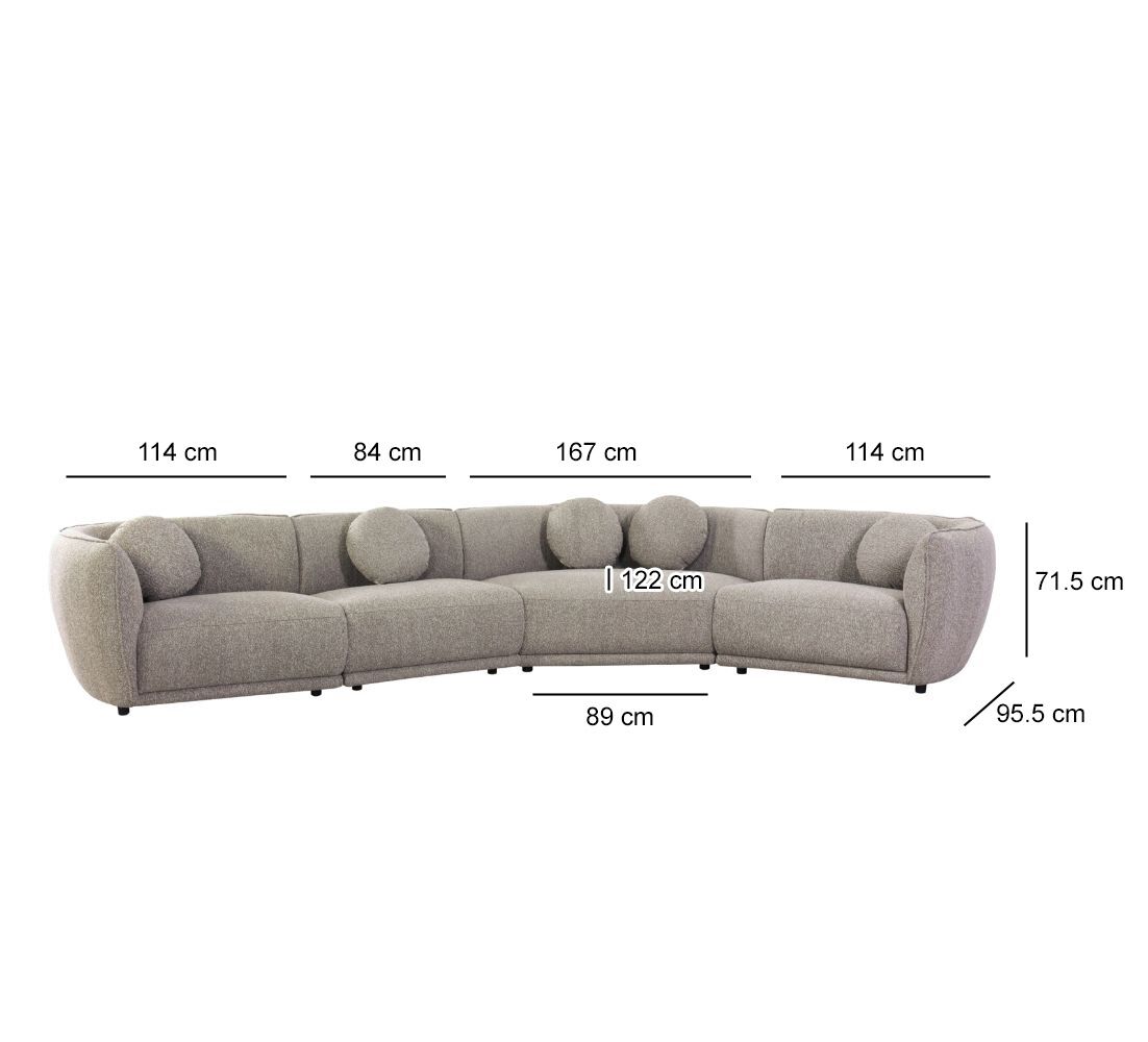 كنبة ذراع يمين : عرض 114 - عمق 95.5 - ارتفاع 71.5 سم كنبة بدون ذراعين : عرض 84 - عمق 95.5 - ارتفاع 71.5 سم كنبة زاوية : عرض الظهر :167 - عرض المقعد من الأمام : 89 - عمق 122 - ارتفاع 71.5 سم كنبة ذراع يسار : عرض 114 - عمق 95.5 - ارتفاع 71.5 سم ارتفاع الأرجل : 4 سم |