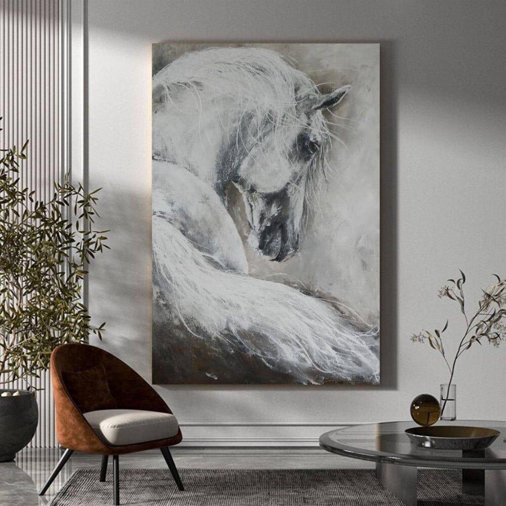 لوحة جدارية ، نمط خيول لخيل ابيض نسخة مطبوعة لرسمة بدقه عالية تجعلك غير قادر على التمييز بين الرسم والطباعة بخلفية فنية مميزة اللوحة مناسبة كعمل فني يعطي جمالا لديكورات المنزل