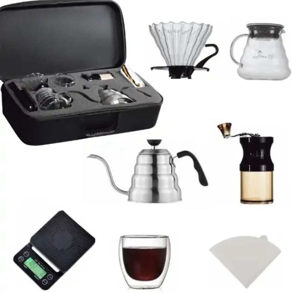 يتضمن الطقم 1 حقيبة - 1 مرشح قهوة -وعاء قهوة زجاجي - 1 مطحنة قهوة يدوية - 1 ميزان رقمي - 1 ابريق تقطير القهوة - 1 كوب قهوة زجاجي مزدوج الجدار - 1 فلاتر ورقية