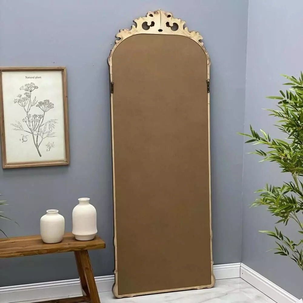مرآة أرضية جانرو هي قطعة ديكور فاخرة بتصميم كلاسيكي مستوحى من الطراز الفيكتوري، تجمع بين الأناقة والرقي لتضيف حضورًا مميزًا لأي مساحة داخل المنزل. يتميز إطارها الخشبي بتشطيب ذهبي معتّق يمنحها طابعًا دافئًا وفخمًا في الوقت نفسه، مع تصميم شابي شيك يتناغم بسهولة مع مختلف أنماط الديكور مثل الكلاسيكي، الريفي أو حتى العصري. بفضل حجمها الكبير، تساهم في تعزيز الإحساس بالاتساع وإبراز جمال المكان بطريقة فنية، كما يمكن استخدامها كمرآة أرضية في الزوايا أو الممرات أو كقطعة ديكور بارزة في غرفة النوم أو المعيشة. تأتي بتصميم متين وجودة تصنيع عالية يضمنان الاستمرارية، لتكون إضافة عملية وجمالية تجمع بين الوظيفة والأناقة في قطعة واحدة مميزة.