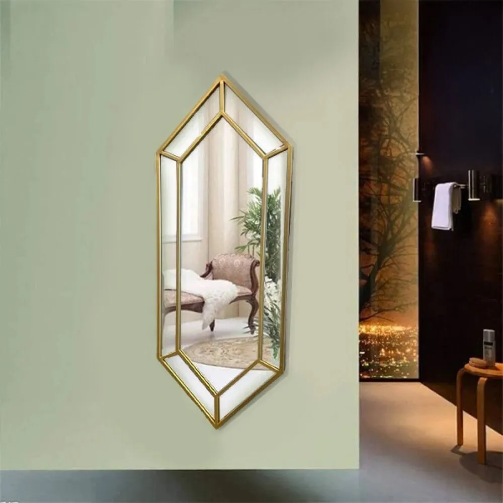 مرآه زجاجية بإطار بلون ذهبي والسطح الزجاجي عاكس بتصميم مستطيل هي قطعة ديكورية فاخرة وجميلة تضيف لمسة من الأناقة والفخامة على المكان. يجمع هذا التصميم بين الفخامة والجاذبية ليضفي جوًا من الرقي على المكان.