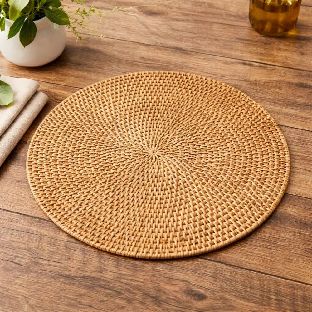 أضفي لمسة من الطبيعة الدافئة إلى طاولتك مع قواعد السلة تنظيم المصنوعة يدويًا من الراتان الطبيعي الصلب. يجمع تصميمها بين الجمال والعملية، حيث توفر مظهرًا بسيطًا وأنيقًا.
