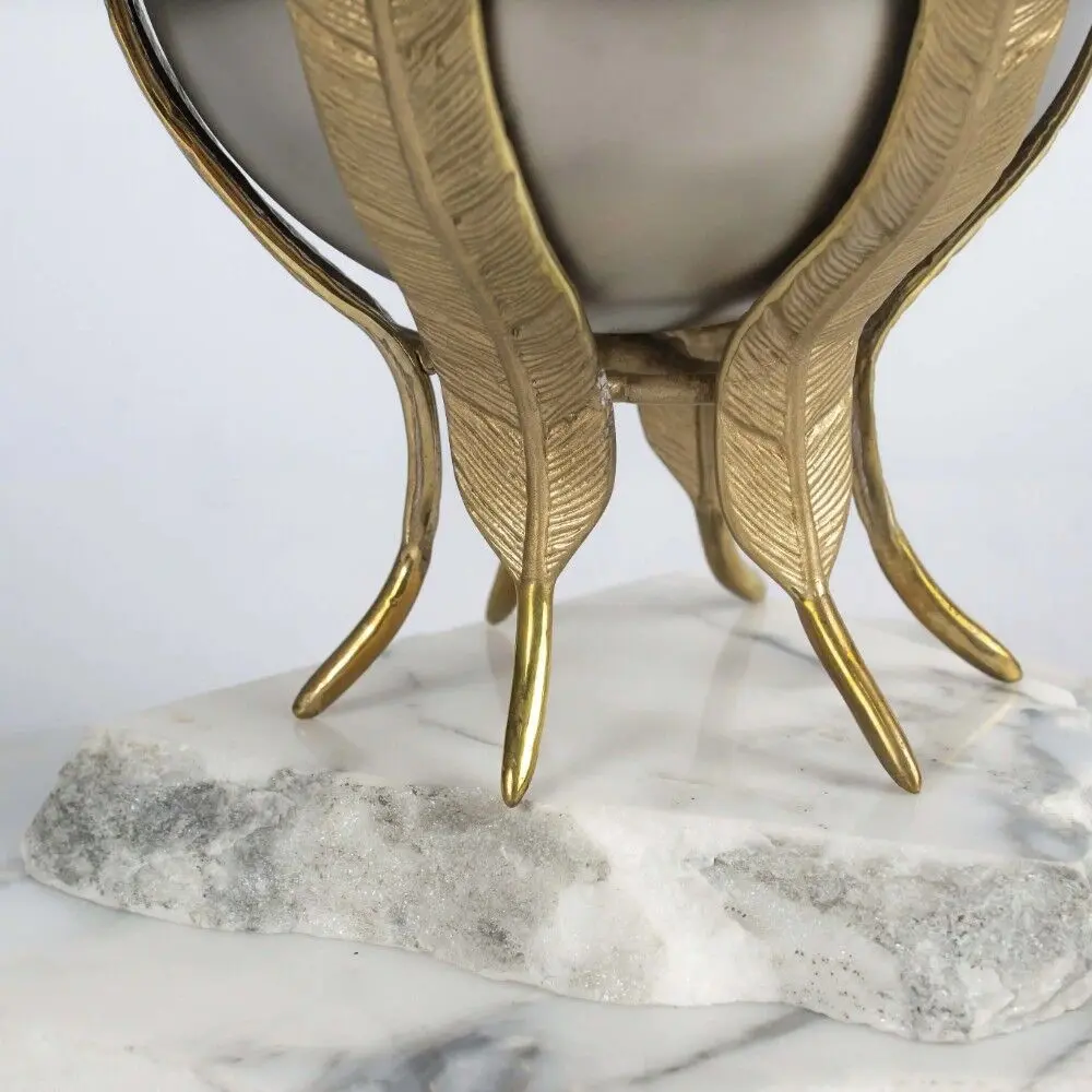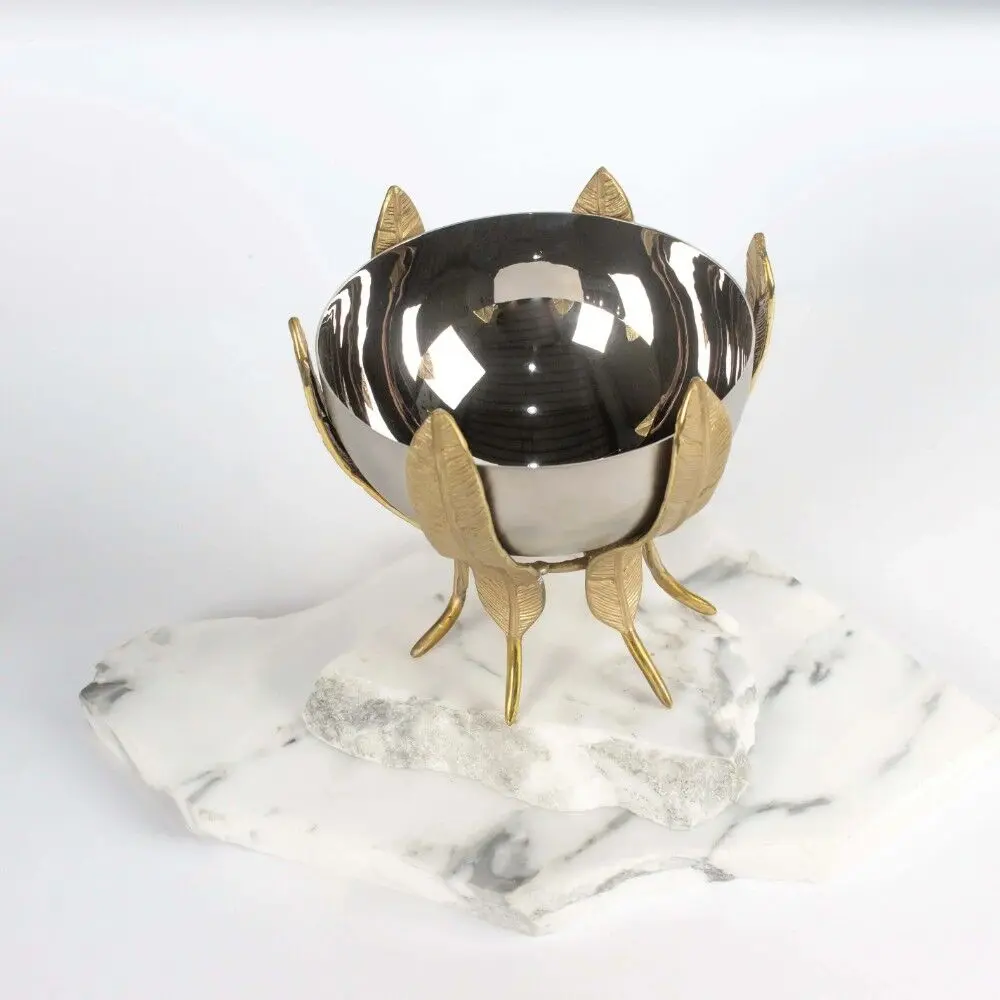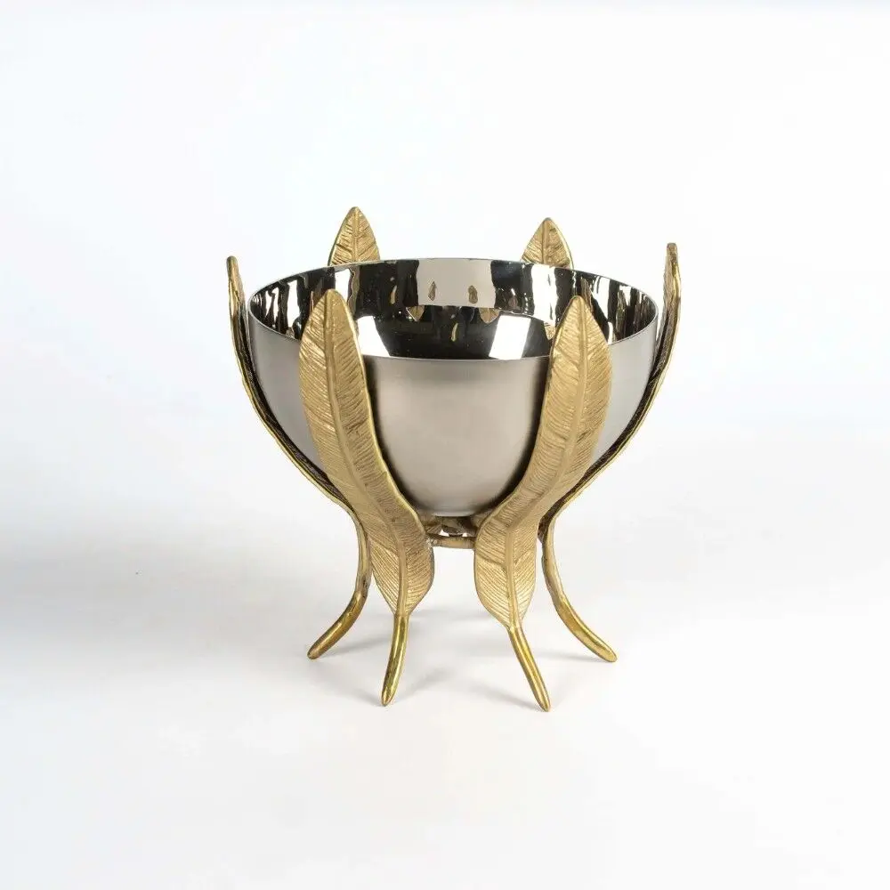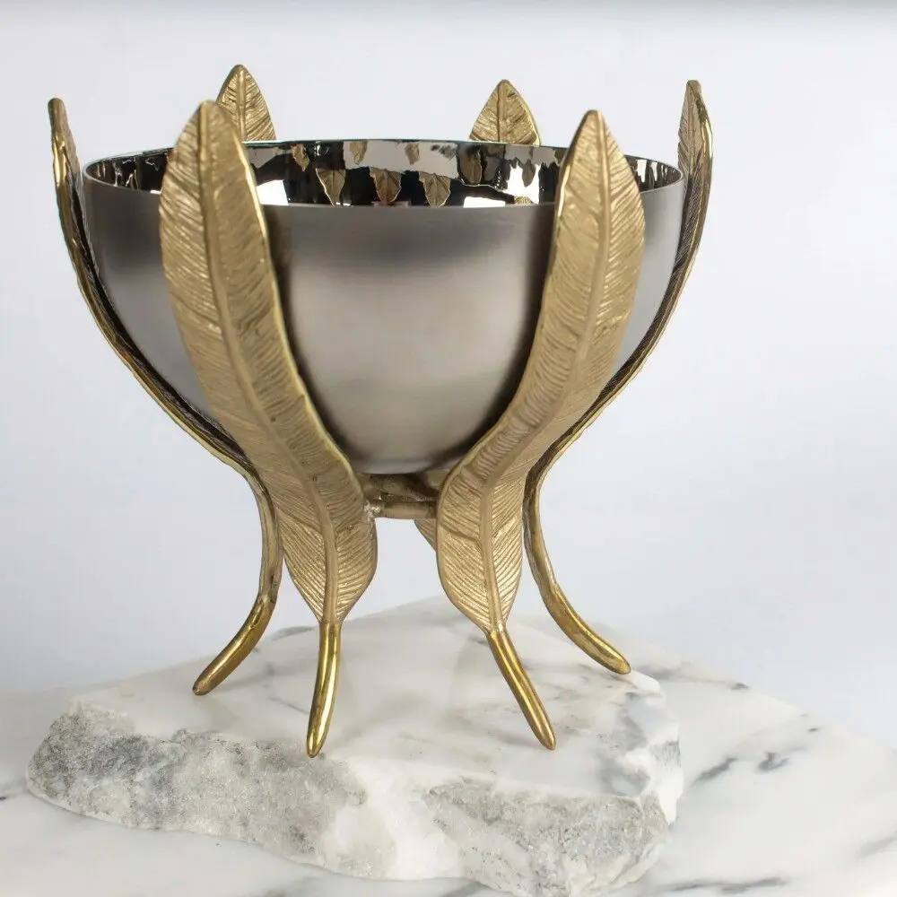 ريش ذهبي يرفع وعاءً بيضاوياً فضياً لامعاً على قاعدة ليشكّل قطعة مركزية فاخرة وملفتة. يمكن ملؤه بالأطعمة الساخنة أو الباردة، أو الحلوى والمكسرات، أو حتى وضع التفاح الأخضر أو البرتقال فيه لعرض أنيق على طاولة الطعام.