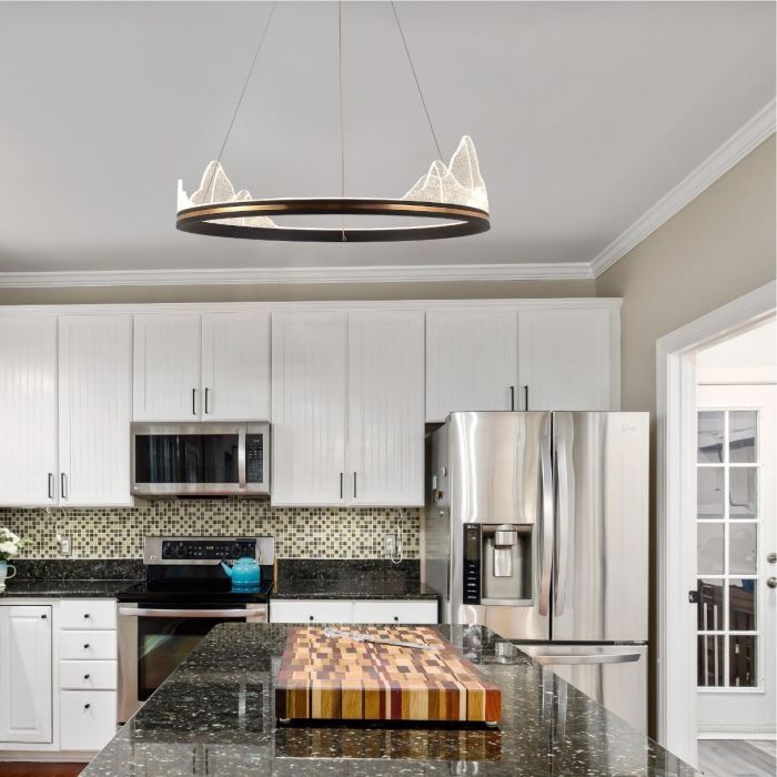 ثريا مودرن بألوان الأسود والذهب، وتبلغ قطرها 80 سم، هي قطعة إضاءة فخمة وجذابة. تتميز هذه الثريا بتصميمها المودرن الأنيق، حيث يتكون إطارها من الألومنيوم باللونين الأسود والذهبي، وهما يعززان بشكل رائع جمالها وفخامتها. تحتوي الثريا على أذرع متعددة يتدلى منها مصابيح أو لمبات، مما يوفر إضاءة دافئة ومناسبة في المساحات المختلفة. يتميز تصميمها بالتفاصيل الجميلة مثل الزخارف والحليات الذهبية، مما يعزز جمالها ويعطيها لمسة من الفخامة. إن الثريا بألوان الأسود والذهب قطعة مركزية مثالية لأي غرفة أو مكان يرغب الشخص في تحويله إلى مساحة أنيقة وأنيقة بلمسة مودرن. تضفي هذه الثريا لمسة من الفخامة والرقي على ديكور المكان وتجذب الأنظار بتصميمها الجميل.