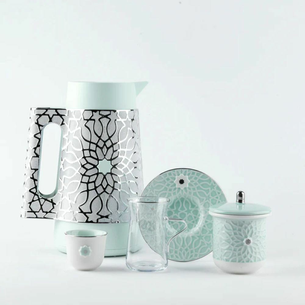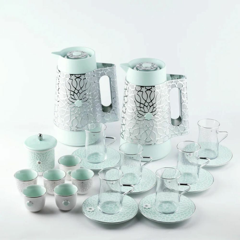 | Kit includes | 6 tea cups, 6 saucers, 6 Arabic coffee cups, a sugar bowl, and 2 thermoses for tea and coffee |