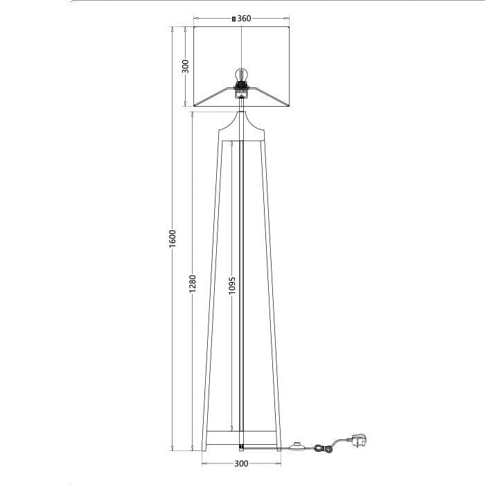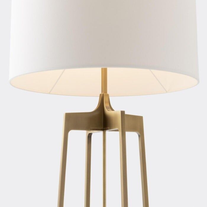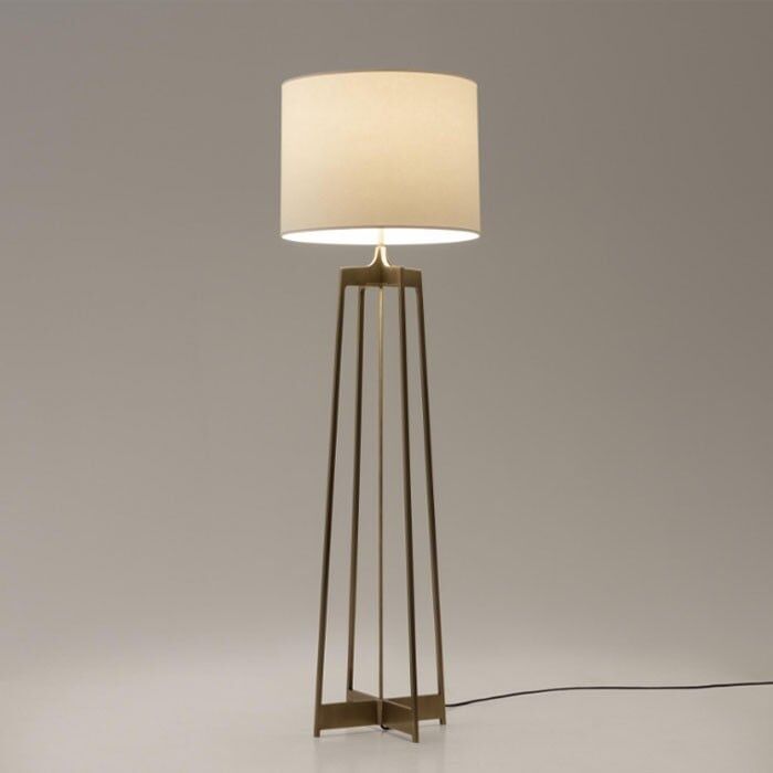 A distinctive golden floor lamp with a triangular shape, unique columns, and a circular base in off-white color. Requires 1 E27 bulb. Dimensions: diameter 36 cm * height 160 cm.