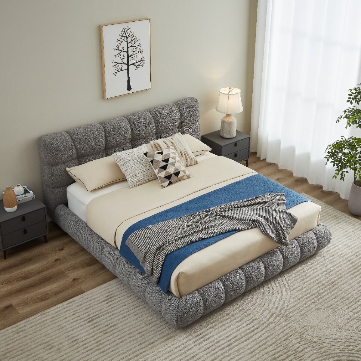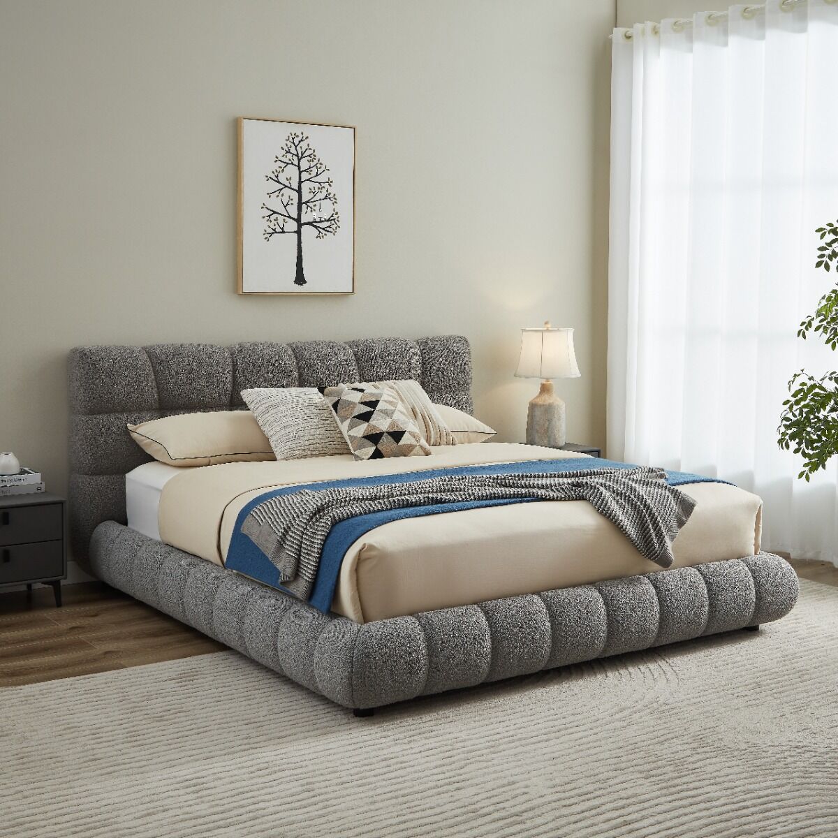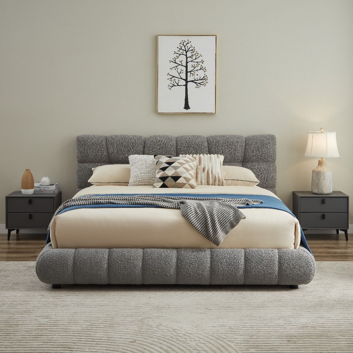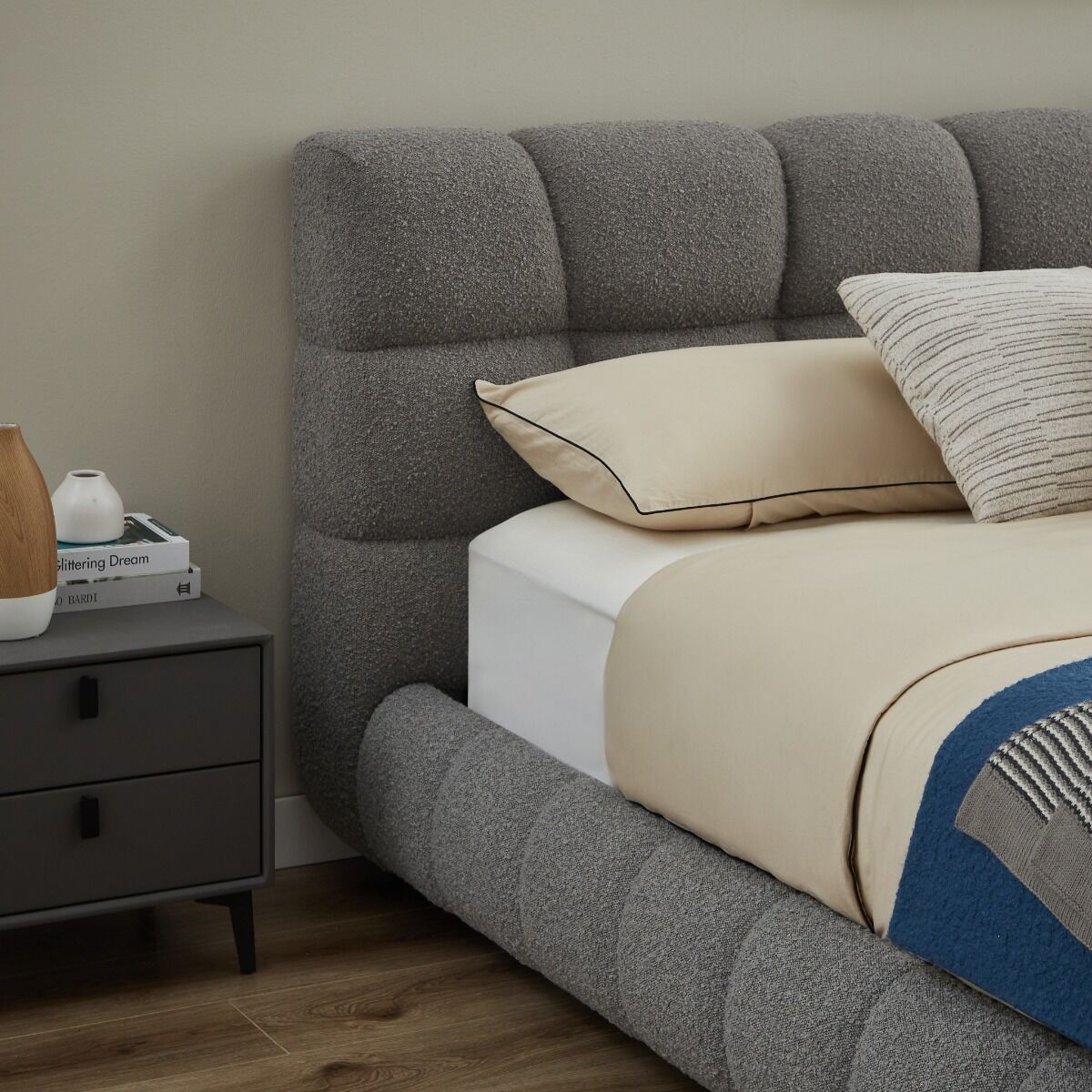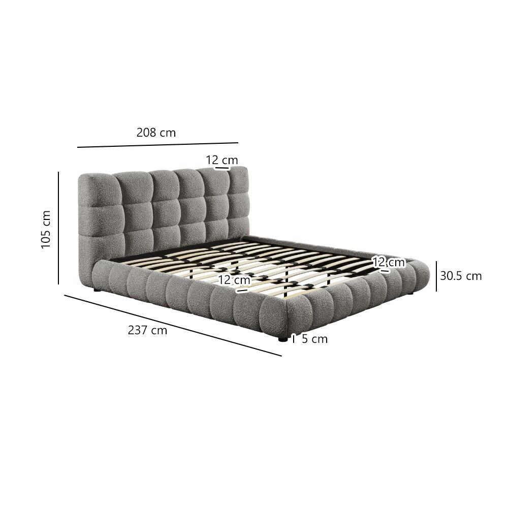 a grey king-size bed upholstered in premium bouclé fabric . It features an elegant design with a geometrically sectioned padded headboard, adding a modern and sophisticated vibe to your room.The bed has a sturdy frame made from solid wood and MDF, providing strong support and lasting stability. The upholstery is crafted from high-quality bouclé fabric with a soft texture and elegant look, and the high-density foam padding ensures extra comfort. The legs are made of durable rubberwood, known for its strength and resilience. Size: King Color: Warm grey that complements all décor styles Upholstery: Soft, elegant bouclé fabric Padding: High-density foam Frame: Solid wood + MDF Legs: Sturdy and durable rubberwood Design: Fully upholstered with a stylishly sectioned headboard for back support Your dream bed awaits at Baytonia – Shop now!Specifications: