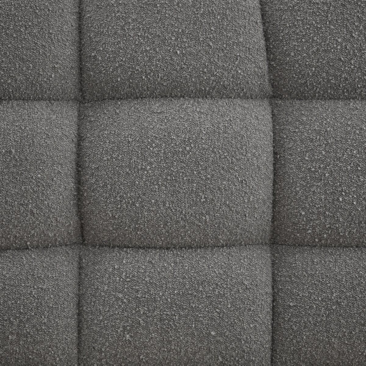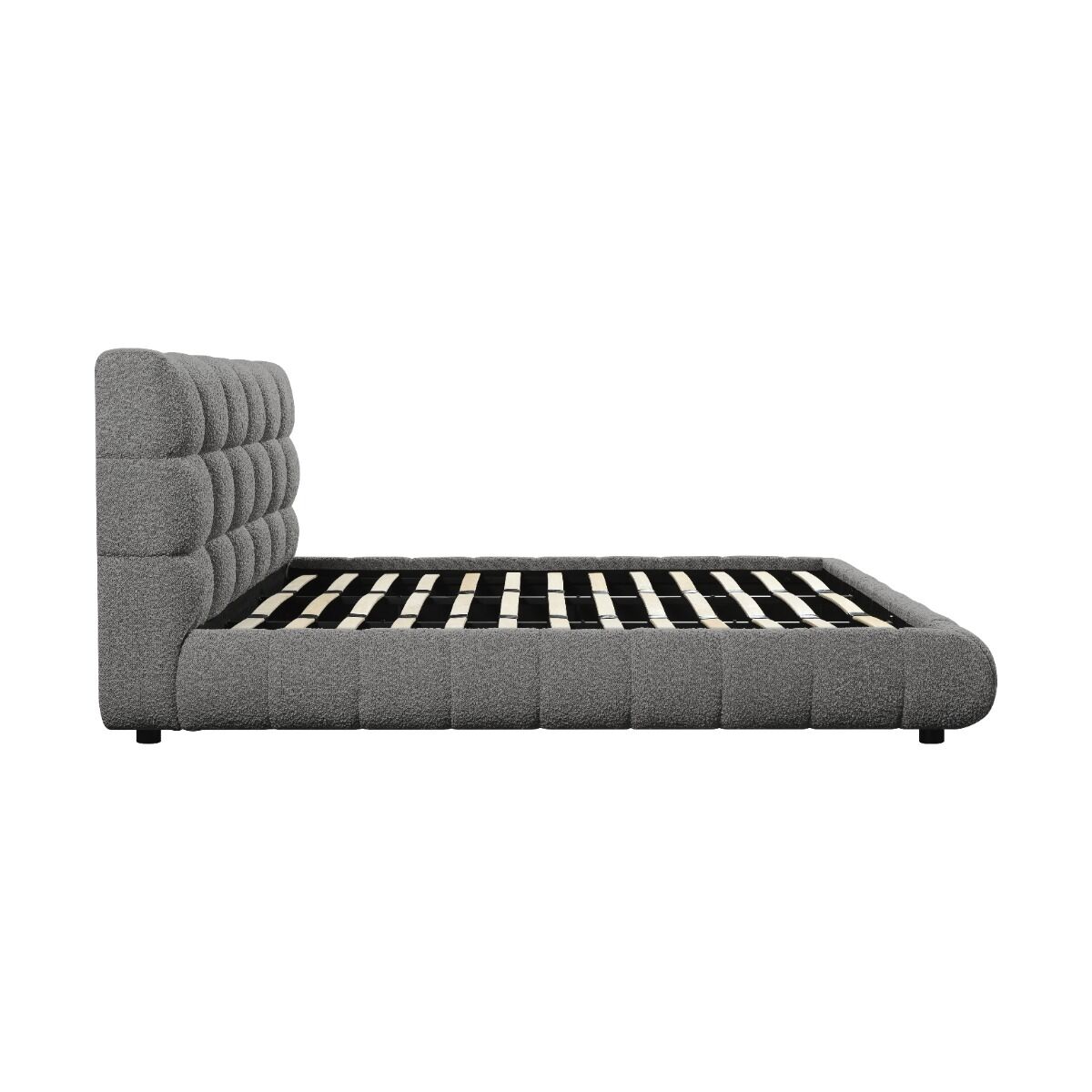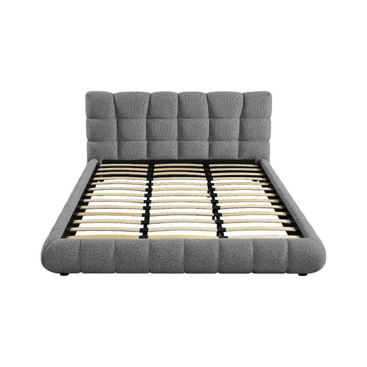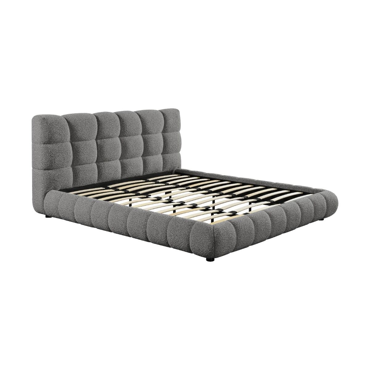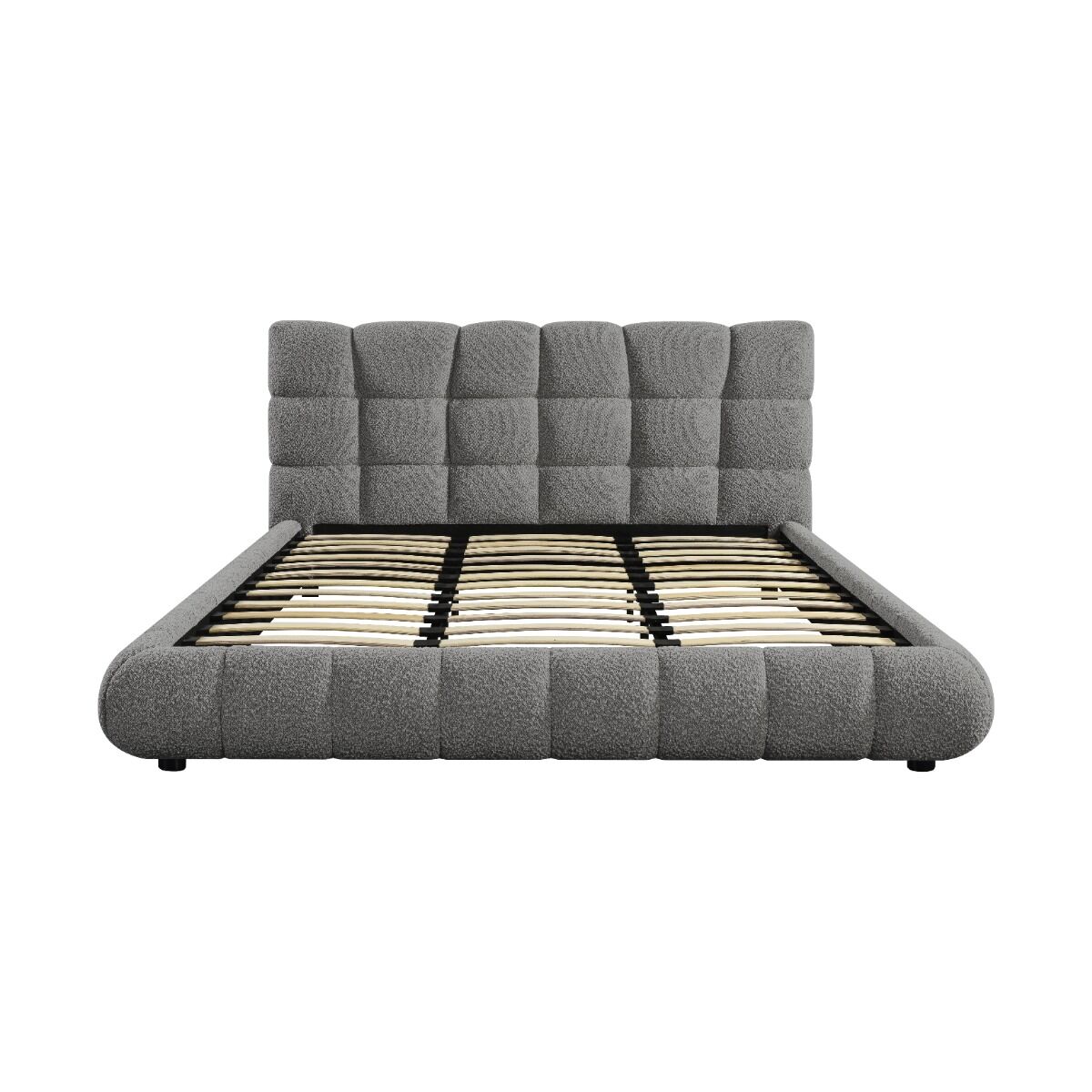 a grey king-size bed upholstered in premium bouclé fabric . It features an elegant design with a geometrically sectioned padded headboard, adding a modern and sophisticated vibe to your room.The bed has a sturdy frame made from solid wood and MDF, providing strong support and lasting stability. The upholstery is crafted from high-quality bouclé fabric with a soft texture and elegant look, and the high-density foam padding ensures extra comfort. The legs are made of durable rubberwood, known for its strength and resilience. Size: King Color: Warm grey that complements all décor styles Upholstery: Soft, elegant bouclé fabric Padding: High-density foam Frame: Solid wood + MDF Legs: Sturdy and durable rubberwood Design: Fully upholstered with a stylishly sectioned headboard for back support Your dream bed awaits at Baytonia – Shop now!Specifications: