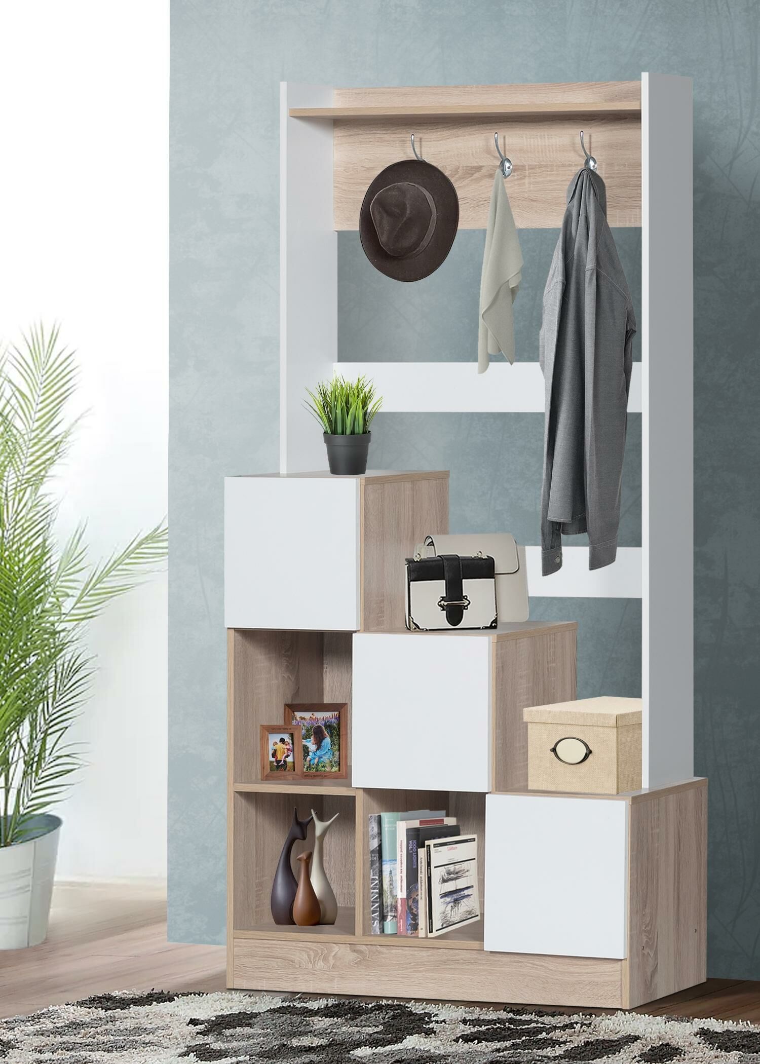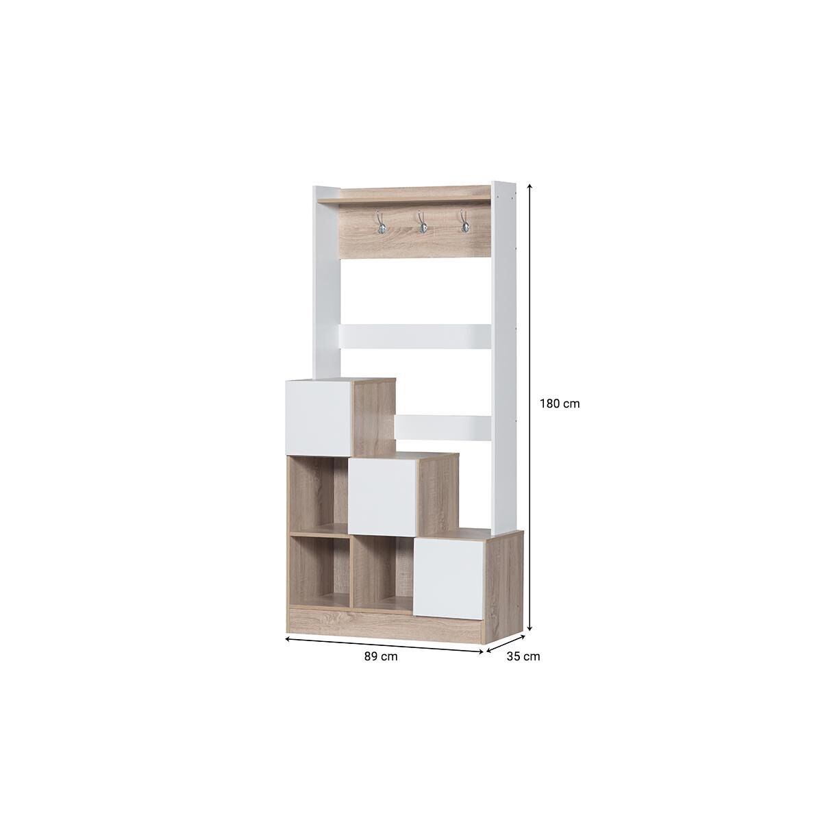 Michia Shelves & Drawers Storage Unit With Hanging Stand Malaysian Wood - Light Walnut & WhiteBecause storage units are one of the most necessary pieces of furniture in the living rooms and the rest of the rooms of the house, we have provided you with the latest storage units with modern and elegant designs. Michia Shelves and Drawers Storage Unit with Luxurious Malaysian-Light Walnut and White Wood Hanging Stand with a simple, elegant and modern design makes a unique addition to every living room. It is also made of high quality and durable wood.Specifications and features of Michia Storage Unit with shelves and drawers in Malaysian wood - Light Walnut and white: The unit is designed in a gradual manner of 3 floors, including open and closed shelves with doors with clothes hangers. It is made with superior craftsmanship from high quality Malaysian wood that has been carefully polished to ensure lasting durability The unit is painted in timeless colors and matches a wide variety of furniture. Simple modern design that matches all modern and classic home décor. Shelves with enough space help you organize large quantities of collectibles. Open shelves enable you to display your unique accessories, antiques and plants in a modern and elegant way. Closed shelves allow you to store some belongings out of sight. The doors are easy to open and close thanks to their durability and distinctive design. With the storage unit, you can arrange books, accessories and various antiques and arrange them according to your taste. The ties also allow you to hang your coats, hats, shawls and whatever you need when you go out. Versatile, attractive, durable and long lasting when following care instructions.
