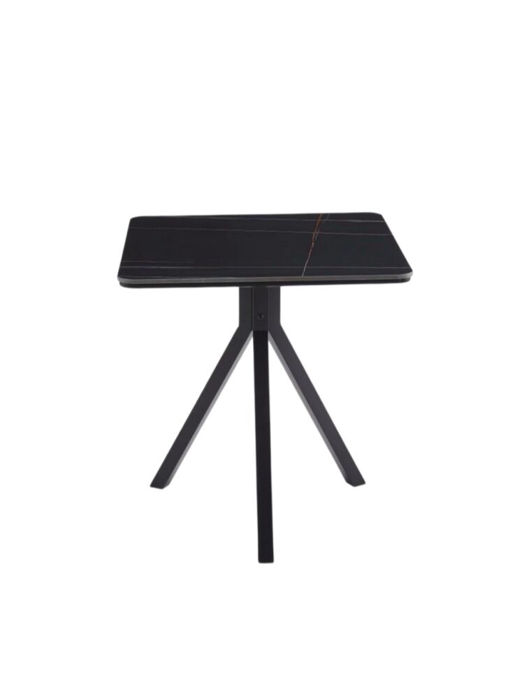 An elegant square dining table, made of ceramic and metal, seats four people. It features a modern design and legs that add a touch of luxury and durability.