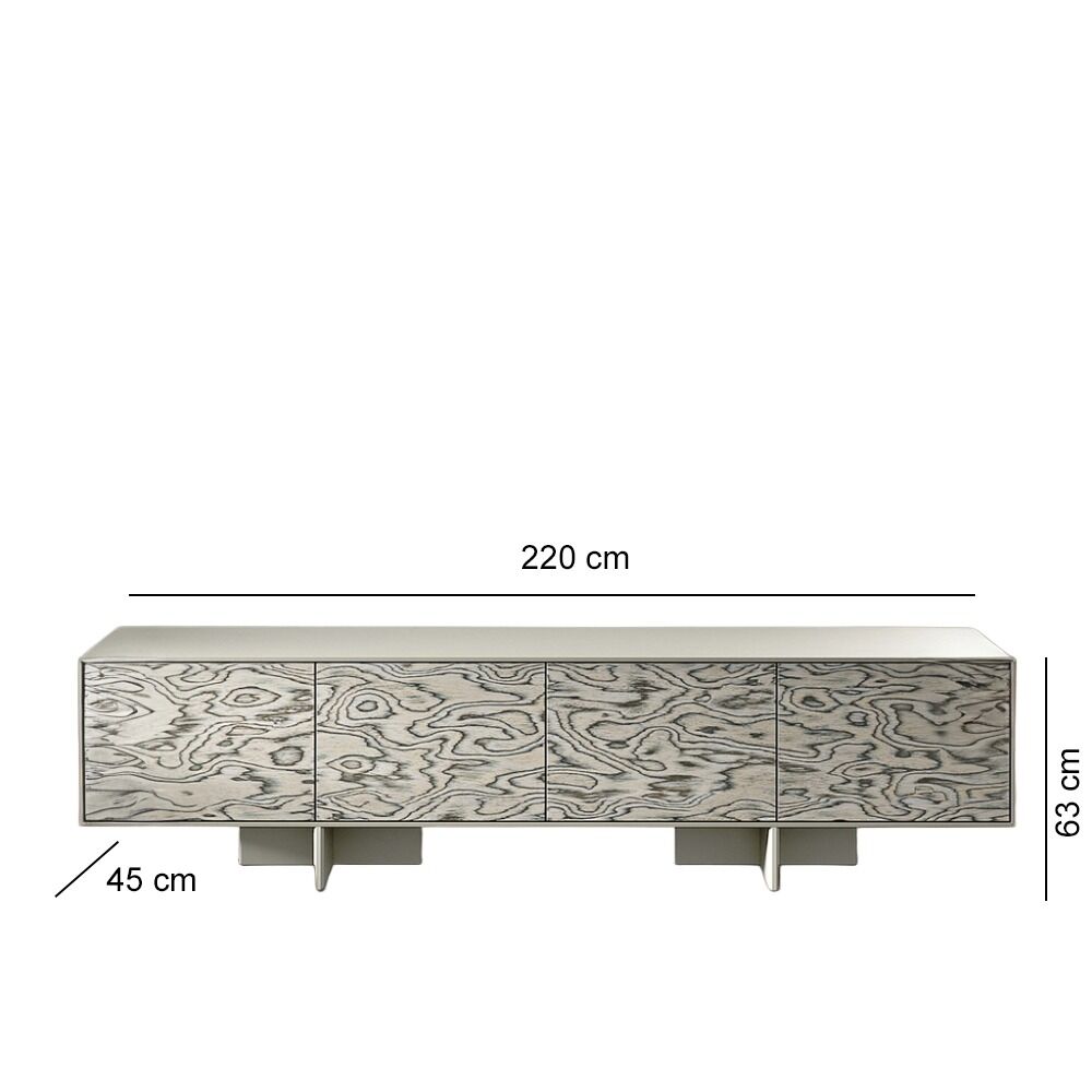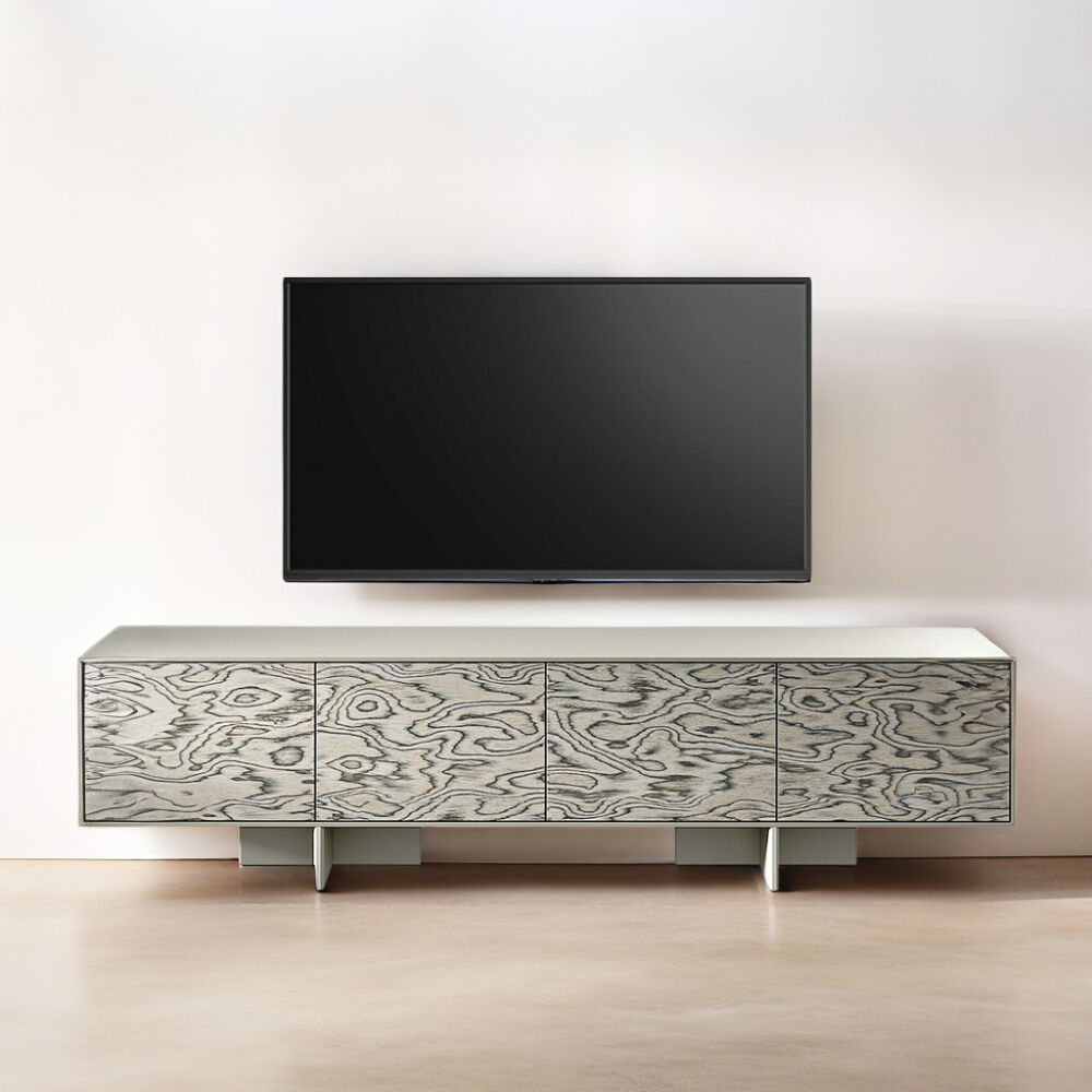 A modern TV stand with a unique artistic design, perfect for those who appreciate fine details and elegant sophistication. This unit features a front with three-dimensional wooden patterns, adding a contemporary artistic touch to any living room or reception area. Its streamlined design and clean lines make it suitable for various interior décor styles.
